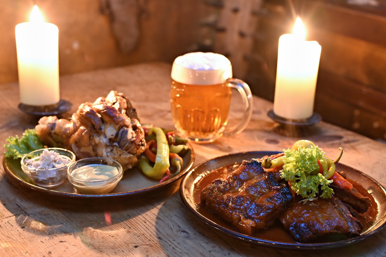 - Côtes de porc fumées, côtes de porc rôties au miel, brochettes de viande variée, ailes de poulet grillées, cuisse de canard confite, jarret de porc rôti à la bière artisanale, blanc de poulet grillé et échine de porc, pommes de terre grillées, maïs, sauces à l’ail et aux prunes